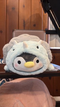 Y665-14” NWT Laying down penguin in a light blue triceratops kigurumi (costume), manufactured by Takashoji$20Arcadia, CA