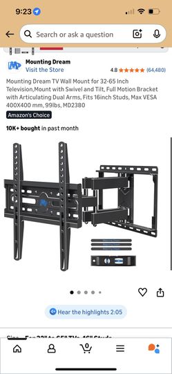 Mounting Dream TV Wall Mount for 32-65 Inch Television,Mount with Swivel and Tilt$30St. Petersburg, FL
