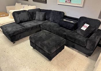 Black Corduroy Reversible Sectional With Cup Holder And Storage Ottoman. Brand New.$750San Antonio, TX