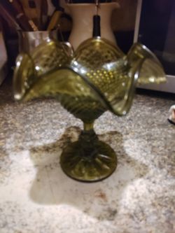 Vintage Ruffled Edge Olive Green Glass Compote With Stem. 6.25” Tall 6.25” Wide$25Houston, TX
