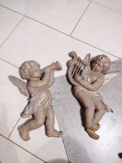 pair of vintage 1960s Syroco wall hangings featuring cherubs or angels playing musical instruments, specifically a harp and a horn.$65Houston, TX