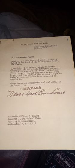 autographed letter from Mamie Doud Eisenhower to Congressman William T. Cahill, dated April 23, 1969. $120Gibbsboro, NJ