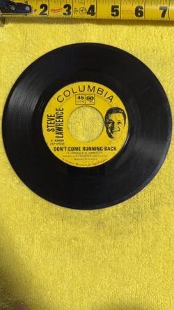 This image shows a vintage Steve Lawrence 7-inch vinyl record, specifically the 45 RPM single titled "Don't Be Afraid, Little Darlin'" released on the$10Monrovia, CA