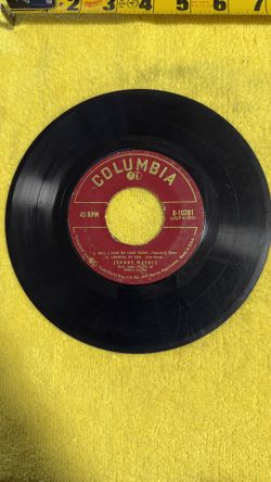 This item is a vintage Columbia Records 45 RPM vinyl record by Johnny Mathis, featuring the songs "Let Me Love You" and "All Through the Night" with t$10Monrovia, CA