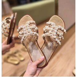 Pearl straw flat slippers for women summer wear high-end beach sandals$499Joliet, IL