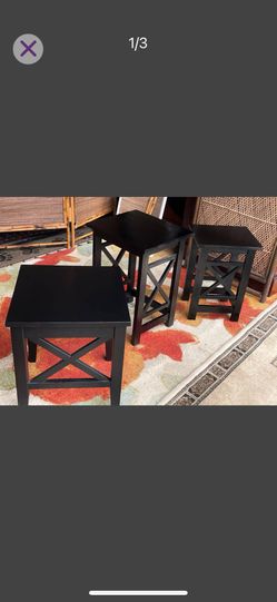 Set of 3- Black Solid Wood Tables, Excellent Condition. Dimensions: 16x14x21H 16x16x19H 13x11x18H $180Portland, OR