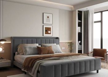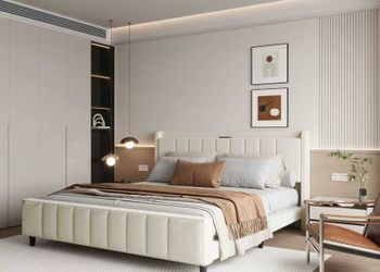 Bed Frame with Wingback Headboard, No Box Spring Needed, Easy Assembly, Platform Bed with Wooden Slats, Beige (King (U.S. Stan$110City Of Industry, CA