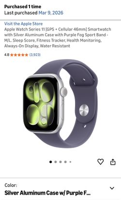 Apple Watch Series 11 [GPS + Cellular 46mm] Smartwatch with Silver Aluminum Case with Purple Fog Sport Band$400El Paso, TX