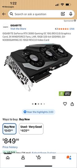 GIGABYTE GeForce RTX 3080 Gaming OC 10G (REV2.0) Graphics Card, 3X WINDFORCE Fans$450Salida, CA