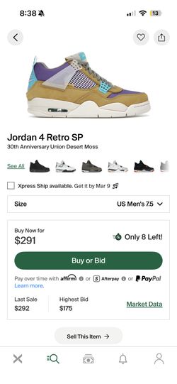 Jordan 4 Union Desert Moss $255Uniondale, NY
