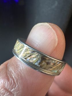 Este es un anillo de carburo de tungsteno de 3,2 mm de ancho con incrustaciones de una mezcla de meteorito, diamantes sin cortar y ópalo Fire & Ice. $200Los Angeles, CA