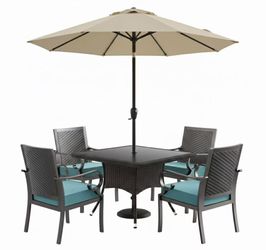 5-Piece Metal Patio Outdoor Dining Set with Rattan Woven Backrest,4 Chairs, Large Table, Umbrella Hole and Blue Cushions$200El Monte, CA