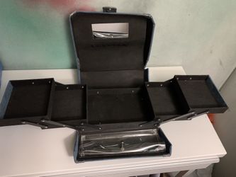 A blue denim-style makeup train case with six cantilever trays and a mirror$40Bonney Lake, WA