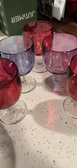 Set of 5 vintage large iridescent pink & purple thumbprint goblets with clear stems$15Waterford, CA