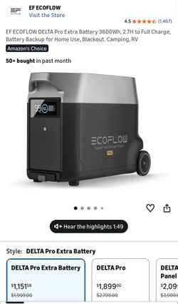 EF ECOFLOW DELTA Pro Extra Battery 3600Wh, 2.7H to Full Charge, Battery Backup for Home Use, Blackout, Camping, RV$899City Of Industry, CA