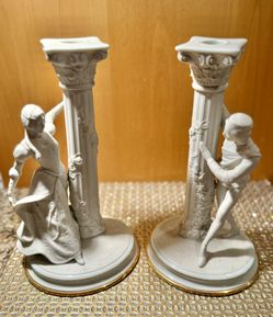 Pair Romeo and Juliet Franklin Mint Candlesticks -White -Gold Trim 1986-Pristine$95Mesa, AZ