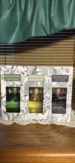 Set of 3 Reed Diffuser fragrances unopened box Island Citrus, Driftwood Sand, Blue Linens 6 oz each$15Sandy, UT
