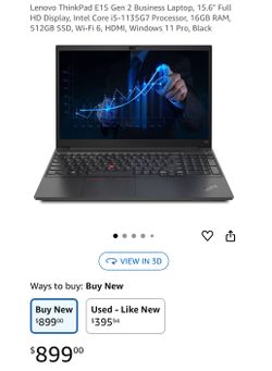 Lenovo ThinkPad E15 Gen 2 Business Laptop, 15.6" Full HD Display, Intel Core i5-1135G7 Processor, 16GB RAM, 512GB SSD, Wi-Fi 6, HDMI, Windows 11 Pro, $750West Palm Beach, FL