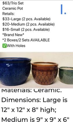Double Glazed Ceramic Pots "No Hole"$13Lathrop, CA