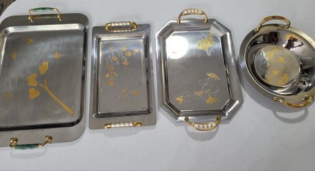 Lot of vntg serving trays. Sketched floral unique handles Gaiorinox ORO 24 K Gold. Steel? $45Plainfield, IL