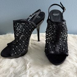 Versace Black Mesh Rhinestone Embellished Strass Heels$295Woodbury, NJ