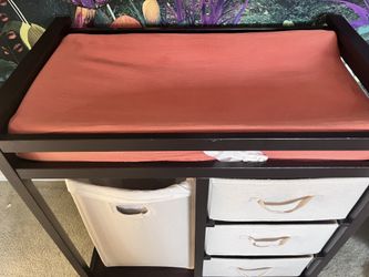 Brown changing table with three drawers, laundry basket, changing pad and cover $65Thousand Oaks, CA
