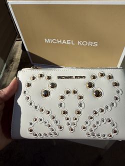 Michael Kors Adele Embellished Leather Smartphone Wallet in white with gold-tone stud embellishments $30Seattle, WA