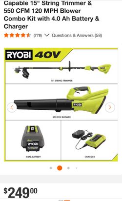 RYOBI 40V Cordless Attachment Capable 15" String Trimmer & 550 CFM 120 MPH Blower Combo Kit with 4.0 Ah Battery & Charger$170Rialto, CA