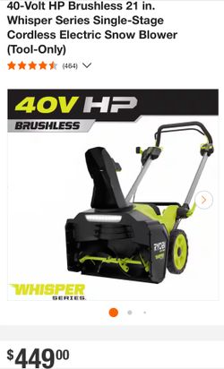RYOBI 40-Volt HP Brushless 21 in. Whisper Series Single-Stage Cordless Snow Blower (Tool-Only)$80Rialto, CA