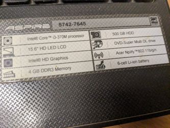 Acer Aspire Laptop Computer 5742 Laptop Labtop Lap Top Charger Power Adapter Included Hdd RAM Not Included Cracked Screen Aspirin$83Grand Prairie, TX