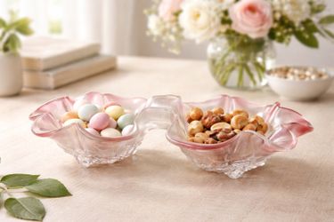Mikasa Japan 1990s Rosella Pink Frosted Double Bowl Candy Relish Dish, 11x7x3”$15Natick, MA