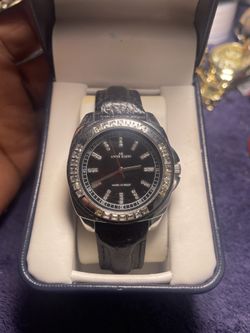 Anne Klein women's watch with a black dial, rhinestone-set bezel, and black leather band.$10Arlington, TX