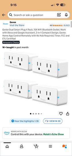 Govee Dual Smart Plug 4 Pack, 15A WiFi Bluetooth Outlet, Work with Alexa and Google Assistant, 2-in-1 Compact Design, Govee Home App Control Remotely $20Cypress, CA