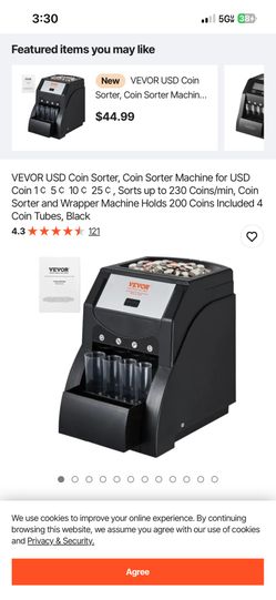 VEVOR USD Coin Sorter, Coin Sorter Machine for USD Coin 1¢ 5¢ 10¢ 25¢, Sorts up to 230 Coins/min, Coin Sorter and Wrapper Machine Holds 200 Coins Incl$40Santa Ana, CA