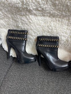 Tory Burch Lysa black leather ankle boots with gold-tone chain-link accents and a stiletto heel$200Miami, FL