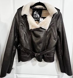 🔥NWT Leather & Shearling Fur Moto Biker Bomber Jacket Chocolate Brown Size L Women’s$75Los Angeles, CA