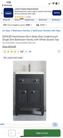New in box KOHLER Hearthaven 24-in Slate Grey Undermount Single Sink Bathroom Vanity with White Quar$279Fair Oaks, CA