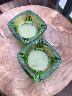 Two Vintage Duncan & Miller MCM Emerald Green Glass Footed Ashtrays Trinket Dishes 3.5”$40Buena Park, CA