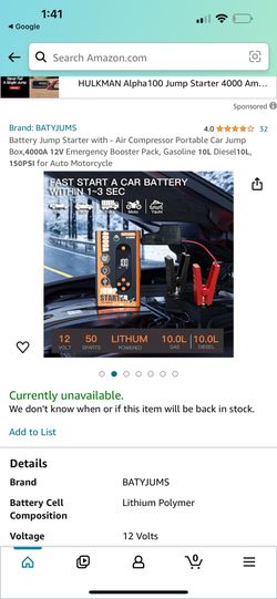 Battery Jump Starter with - Air Compressor Portable Car Jump Box,𝟰𝟬𝟬𝟬𝗔 𝟭𝟮𝗩 Emergency Booster Pack, Gasoline 𝟭𝟬𝗟 Diesel𝟭𝟬𝗟, 𝟭𝟱𝟬𝗣𝗦𝗜 $70Colorado Springs, CO