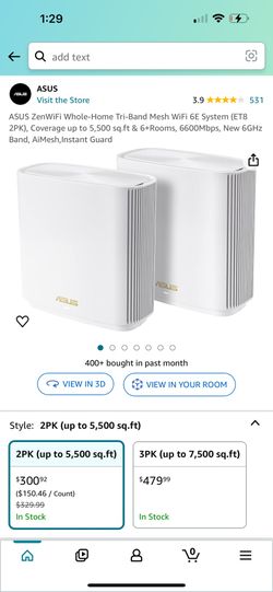 ASUS ZenWiFi Whole-Home Tri-Band Mesh WiFi 6E System (ET8 2PK), Coverage up to 5,500 sq.ft & 6+Rooms, 6600Mbps, New 6GHz Band, AiMesh,Instant Guard$170Colorado Springs, CO