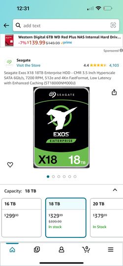 Seagate Exos X18 18TB Enterprise HDD - CMR 3.5 Inch Hyperscale SATA 6Gb/s, 7200 RPM, 512e and 4Kn FastFormat, Low Latency with Enhanced Caching (ST180$100Colorado Springs, CO