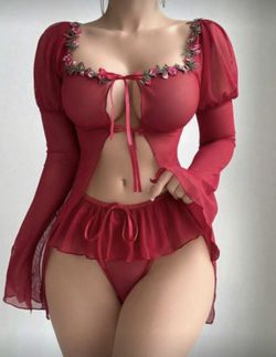 Women's New Charming Semi-Transparent Lingerie Nightdress Set, Floral Square Neck, Top With Hollow Chest And Bell Sleeves, Elegant And Comfortable Nig$10Miami, FL