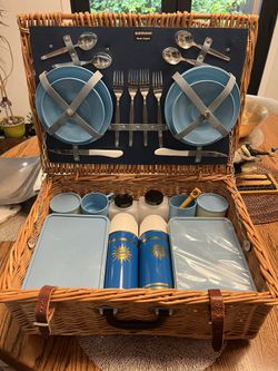 Vintage UK 1970's Sirram Wicker Picnic Basket for 4$125San Mateo, CA