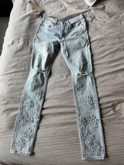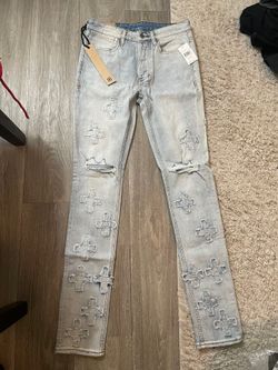 Faded Blue And White Robin Jeans , Gold And Red Studded Pocket Flaps$75Atlanta, GA