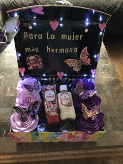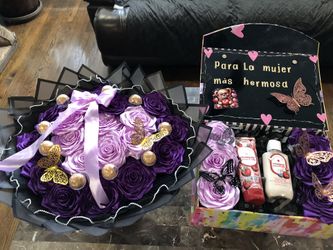 Ramo De Flores Eternas Y Caja Con Lociones $125 Por Las Dos Muy Bonita Para Regalo De El Día De La Mujer Cumpleaños Cualquier Ocasión $125Chicago, IL