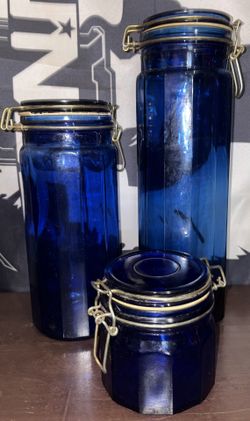 Vintage Cobalt Blue Glass Latch Jar Set Of 3 Paneled Design great condition $50Mcallen, TX