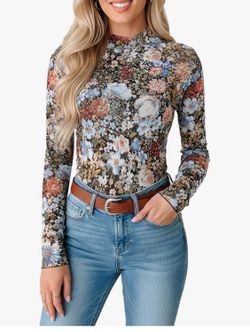Women's Floral Mesh T-Shirt, High Neck, Long Sleeve, Floral Shirts$20Whittier, CA