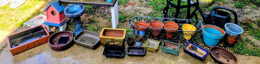 Assorted garden planters and birdbath and watering can$50Houston, TX