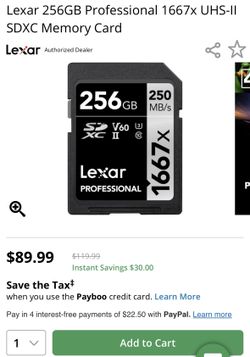 Lexar Professional 256GB 1667x UHS-II SD Card$69New York, NY
