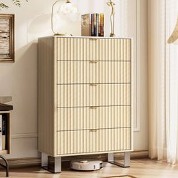 NEW005-beige $95 Fluted 5 Drawers Dresser, 48" H Modern Country Storage Dressers with Brushed Metal Handles, Wood Storage Organizers for Bedroom, Liv$95Rancho Cucamonga, CA